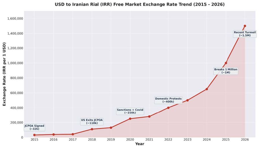 其中加密貨幣的出現,使伊朗在全球制裁體系中找到了一條前所未有的漏洞。伊朗對加密貨幣的興趣始於 2017 年前後,當時制裁使其難以進入國際金融市場,政府甚至允許大規模比特幣挖礦,年產值接近 10 億美元。這些比特幣不僅是資產,更是跨境支付工具,伊朗在加密貨幣,尤其是比特幣的需求上也逐年提昇,相對的伊朗本國貨幣自 2015 年伊核協議(JCPOA)達成後,當時約為 1:32 美元兌換里亞爾(波斯語:ریال;貨幣編號 IRR;標誌:﷼),但 2018 美國退出伊核協議後,里亞爾迅速貶值,至 2026 年以到了 1:150 萬達里爾的誇張數字。