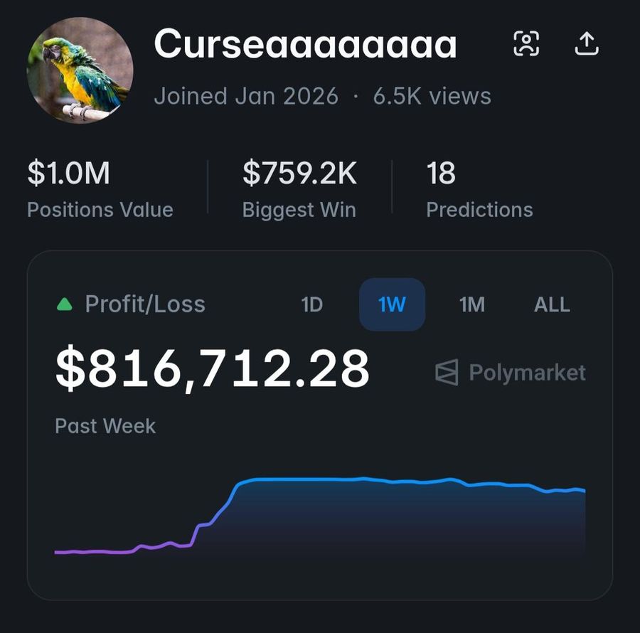 其中成交量最大的 Polymarket 交易員帳戶名為「Curseaaaaaaaa」,透過押注獲利 75 萬美元。