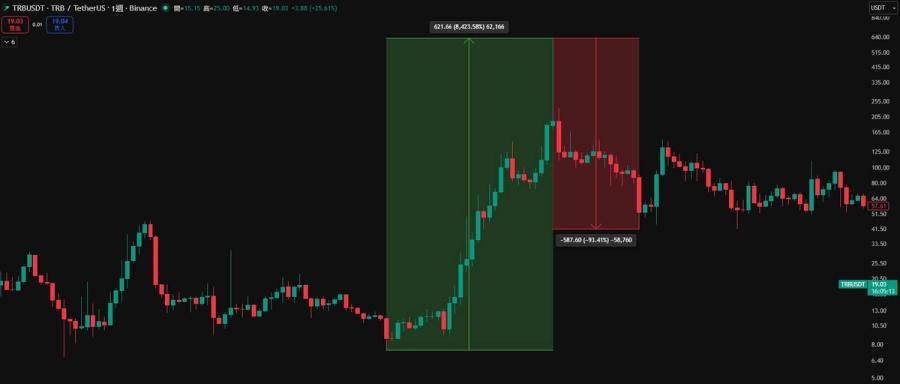 若要找最典型的前例,TRB 是最像的。Tellor 在 2023 年底到 2024 年初曾出現極端上沖下洗,根據 CoinDesk 記錄到 TRB 曾在極短時間從 12 美元衝到約 720 美元後又快速跌回約 90 美元,24 小時內造成破億美元清算。