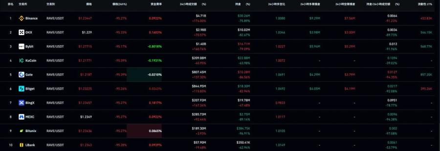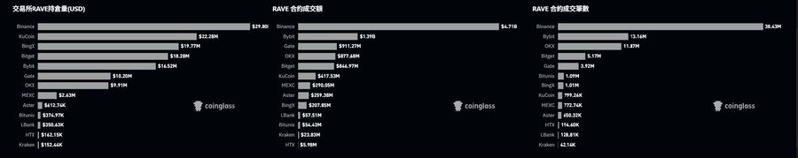 CoinGecko 的市場頁面顯示,RAVE 在不同時點的主要現貨成交分布集中於 Bitget、Coinbase、Gate、PancakeSwap 與 Uniswap 等平台,其中 Bitget 佔比相當高。PANews 則進一步指出,事發當時 Bitget 被視為現貨主戰場,OKX 則是永續合約主戰場之一。