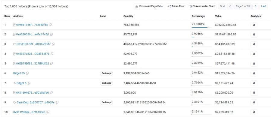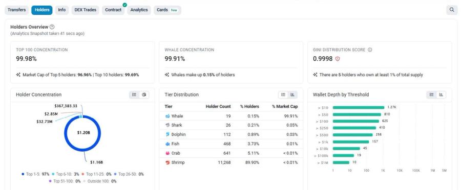 更關鍵的不是低流通本身,而是低流通再加上極高集中度。根據 Etherscan 公開鏈上數據,以及 Arkham 監測顯示前 10 大地址控制了 99.95% 的總供應,其中三個被廣泛認為與團隊相關的 Gnosis Safe 多簽地址,分別持有 77.8%、9.9% 與 4.51%。