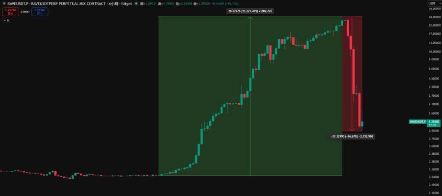 根據 Bitget 交易所合約價格,RAVE 在 2026 年 4 月 9 日,從 0.2 美元一路開始暴漲,短短一週時間,價格瘋漲到 28 美元,翻了 140 倍,隨後又在一天時間內,從 28 美元高點崩跌 99%,跌回低點 0.9 美元。