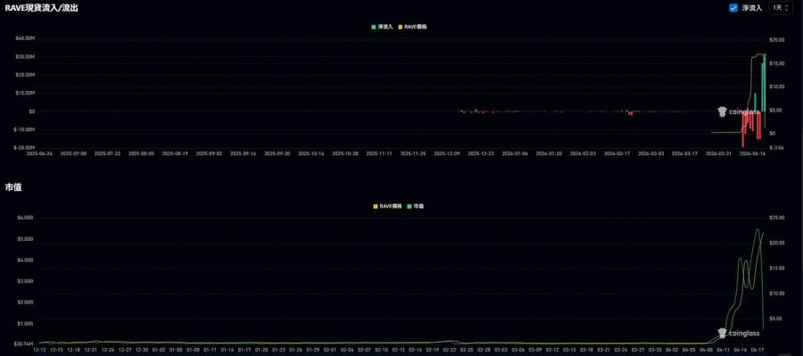 值得注意的是,RAVE 在再度突破 27 美元時,未平倉量並不是無限制擴張。截至 4 月 18 日,RAVE 的幣本位持倉量已降至約 2,548.85 萬枚,較 4 月 11 日峰值約 1.5 億枚下降 83%。