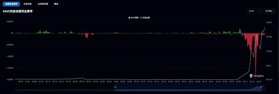 RAVE 最極端的地方,在於資金費率。根據 AZAlpha 鏈上研究員整理,4 月 13 日到 15 日高峰期,RAVE 年化資金費率曾達到約 -1000% 到 -4000%。