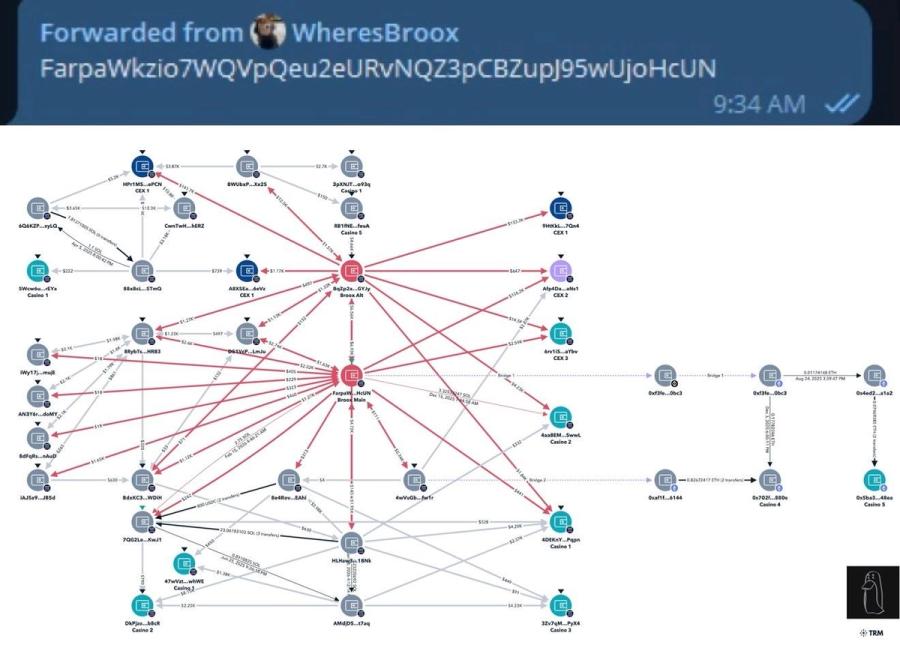 ZachXBT 表示:Broox 的主要錢包是透過私人聊天訊息中的內容被識別,並且所有直接相關地址已被繪製成關聯圖。