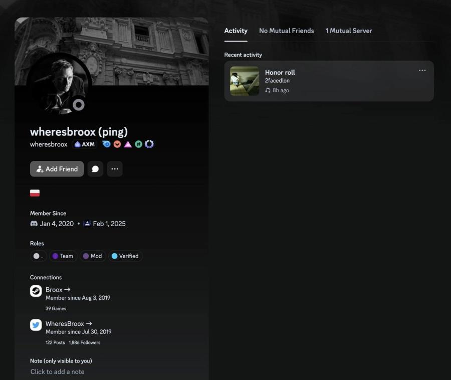 Gowno(Seb): 在通話中與 Broox 同場,為 Broox 的親近朋友。身分為 Axiom 新聘 moderator(版主/管理員)。
