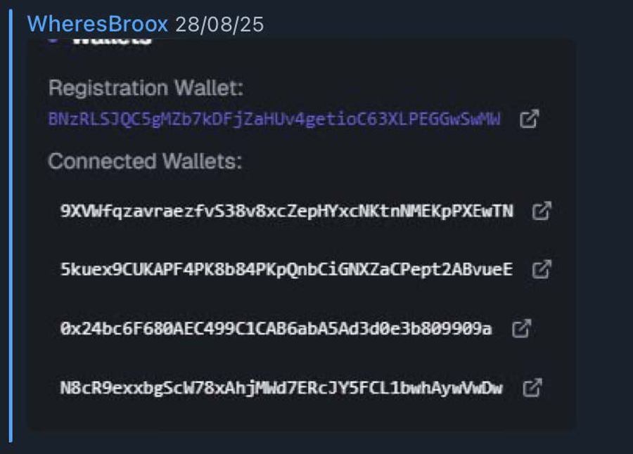2025 年 8 月(August 2025): Broox 傳送第二張圖片,顯示交易者 'Monix' 的註冊資訊與已連結錢包(registration and connected wallets)。Broox 亦討論了對於交易迷因幣 'AURA' 的 Axiom 用戶進行查詢(lookups)。