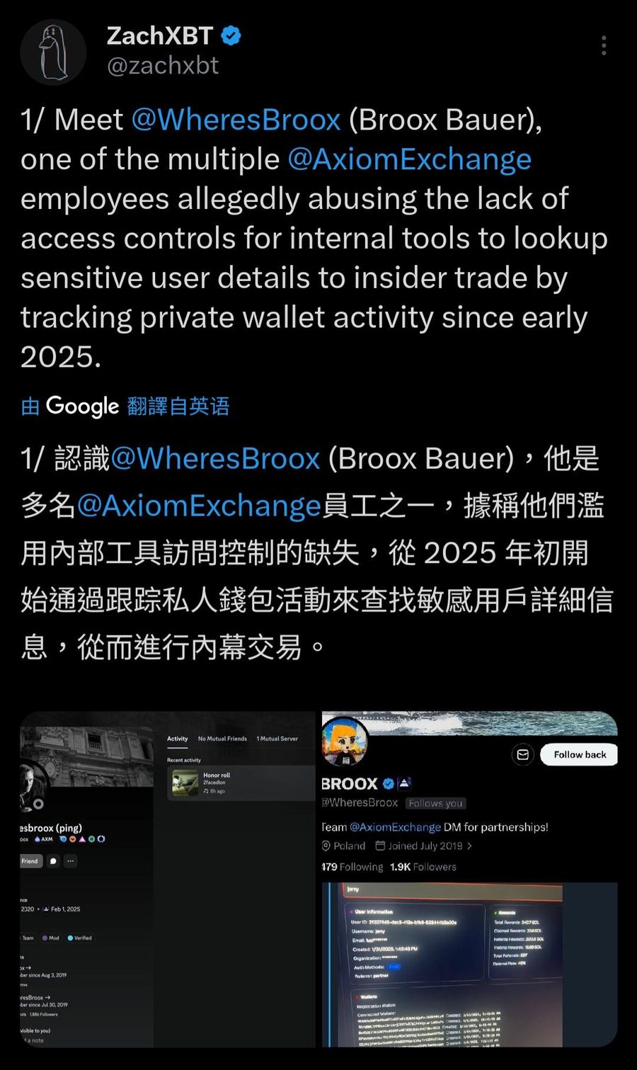 ZachXBT 描述 Broox 曾於不同時間分享 Axiom 內部儀表板截圖,內容涉及特定交易者之「私密錢包」與「註冊/連結錢包」: