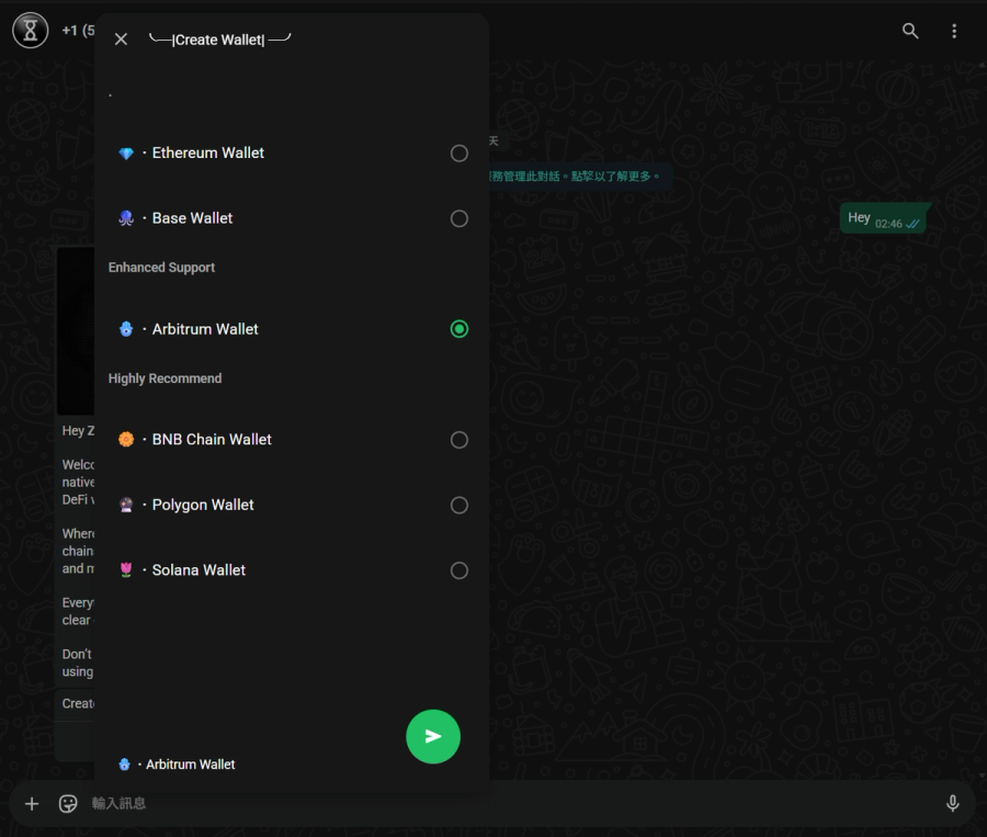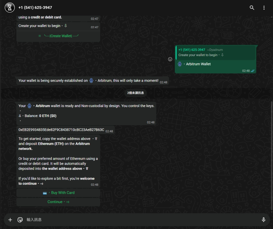 打開 WhatsApp 搜尋 Dyadnum,對話視窗開啟後系統會引導建立錢包。支援鏈包括:Ethereum、Base、Arbitrum(Enhanced Support,官方推薦)、BNB Chain、Polygon、Solana。