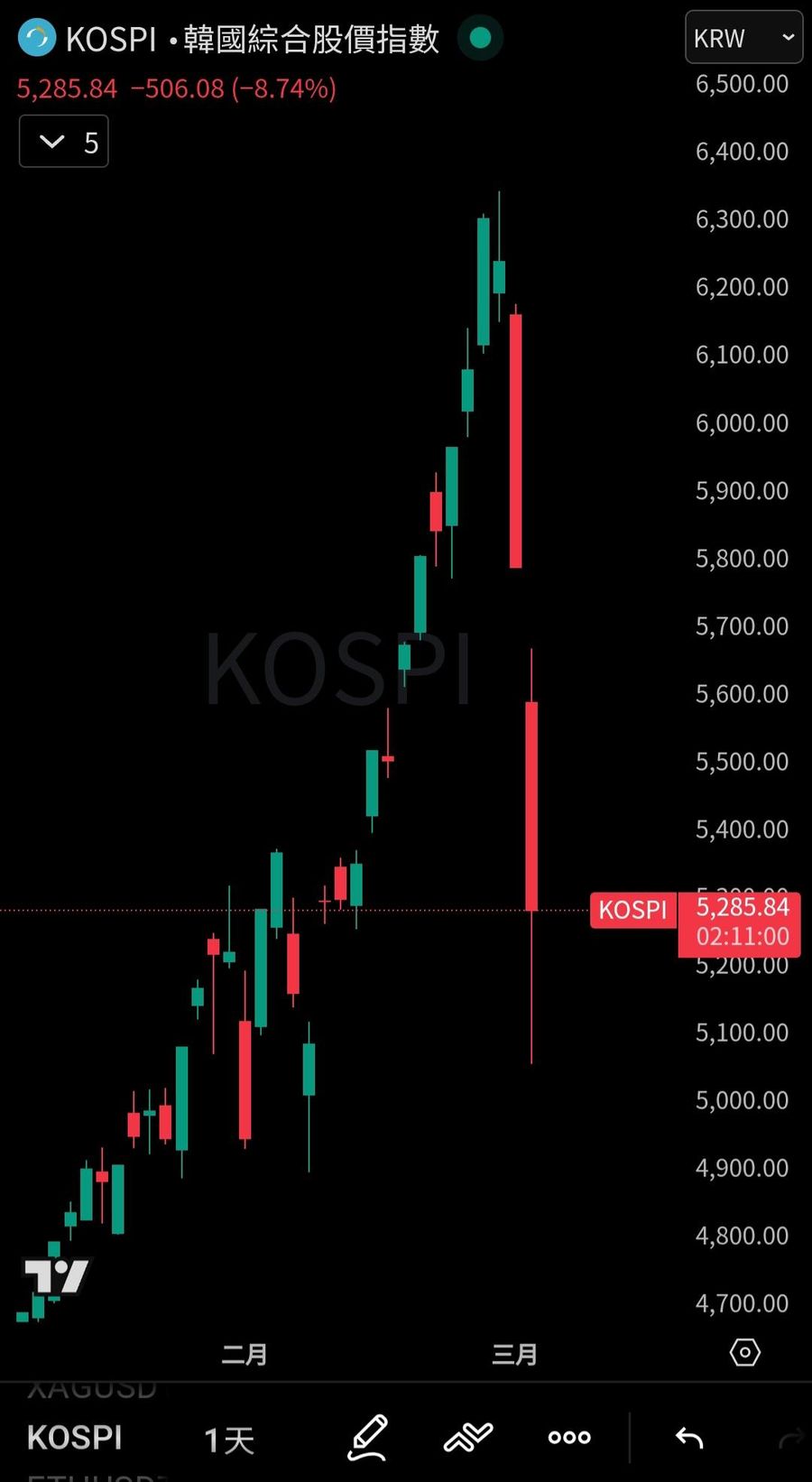 兩日累積來看,KOSPI 從 6,300 高點跌至低點 5,000,跌幅高達 20%,為 2009 年以來最糟等級。