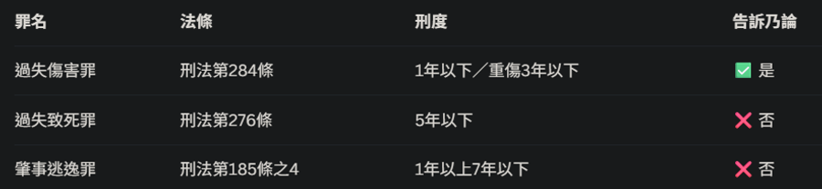 法律依據: 刑法第 185 條之 4、第 276 條、第 284 條;道路交通事故處理辦法第 13 條 本文內容為一般性法律知識分享,不構成個案法律意見。如有具體交通事故法律問題,建議諮詢專業律師。